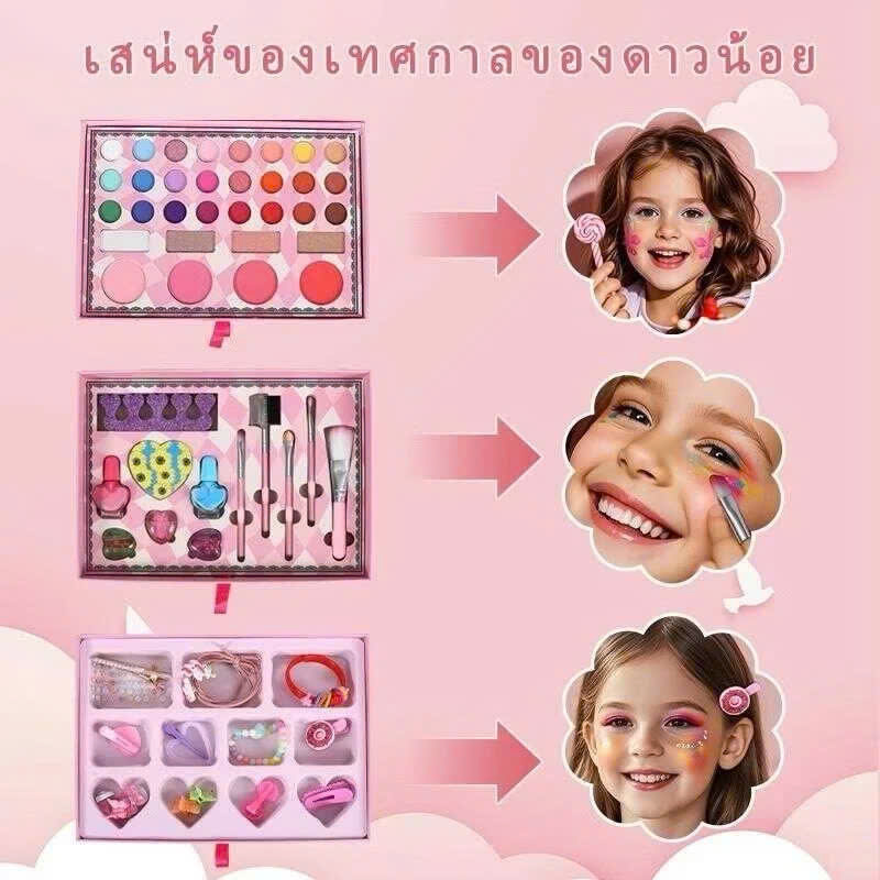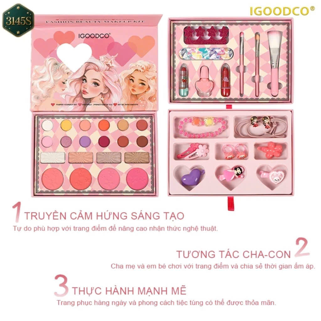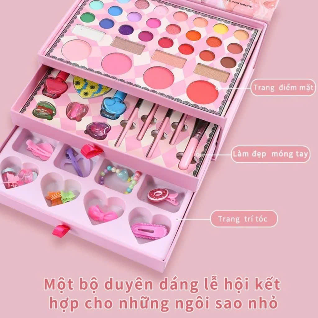 🌼🌼Hộp trang điểm 3 tầng: Với nhiều phụ kiện thú vị như sơn móng tay, dây buộc tóc, nhẫn, phấn và son. Hộp có 3 tầng giúp trẻ sáng tạo và khám phá. An toàn và dễ làm sạch: Sản phẩm được thiết kế an toàn cho trẻ em, đảm bảo trải nghiệm vui vẻ mà không lo nguy hiểm.