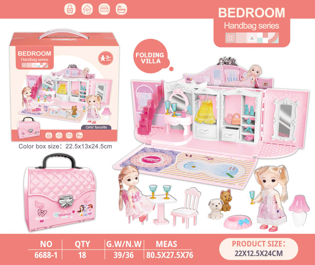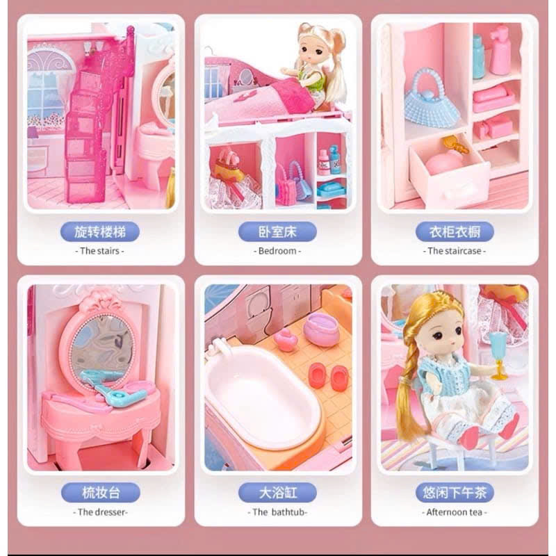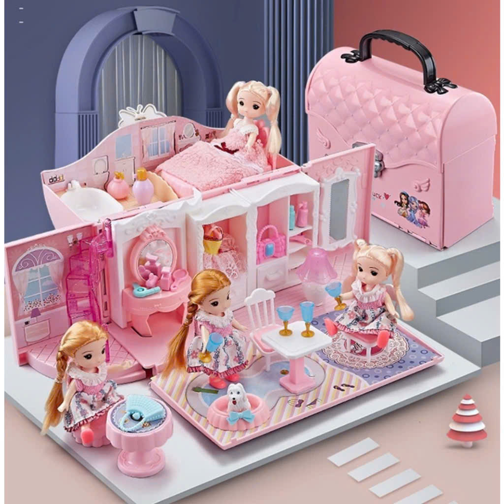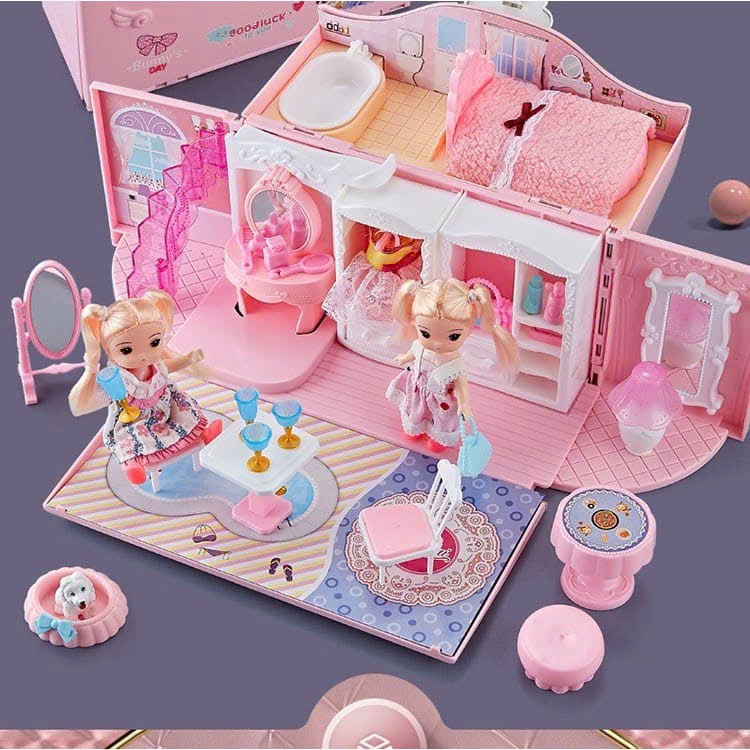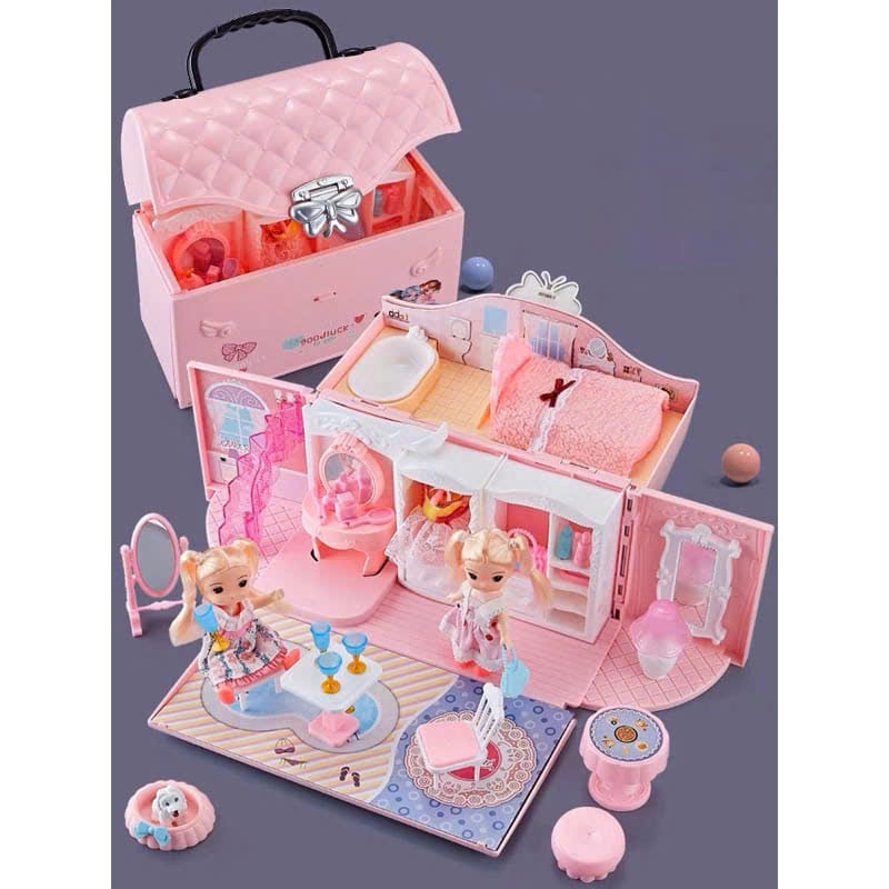 🌺🌺Ngôi nhà búp bê thiết kế dạng túi xách kèm 2 búp bê, đồ chơi búp bê màu hồng dễ thương cho bé. Túi xách nội thất nhà búp bê màu hồng có đầy đủ các chi tiết: phòng khách, phòng tắm, nhà bếp, bàn ghế, các vật dụng thường ngày trong nhà, chú chó đáng yêu, kẹp tóc… và bé búp bê hồng xinh xắn.